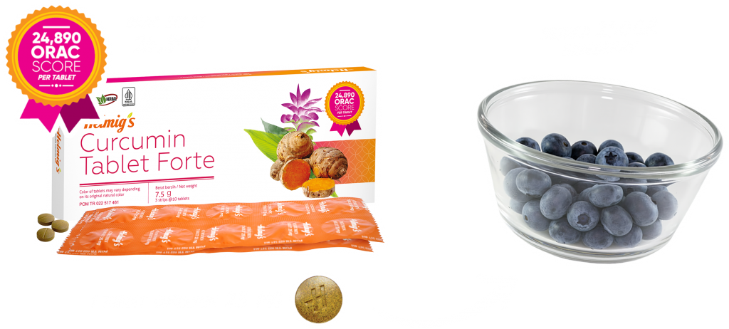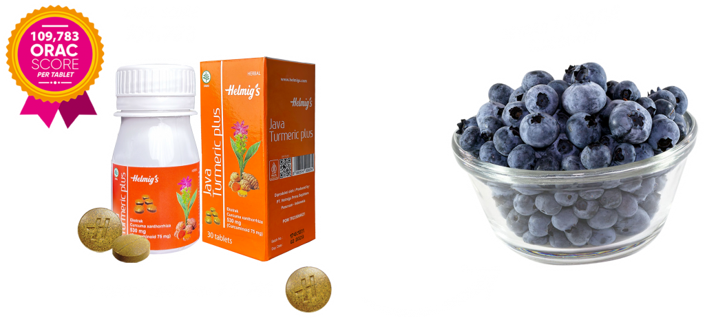 * 1 Tablet Curcumin 25 mg setara dengan 250 gr Blueberry dengan angka ORAC 24.890
